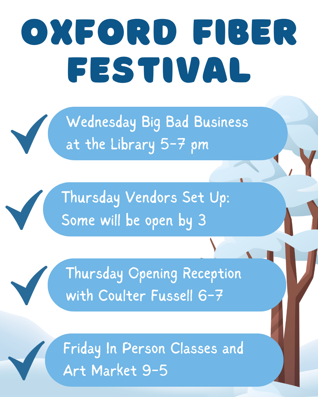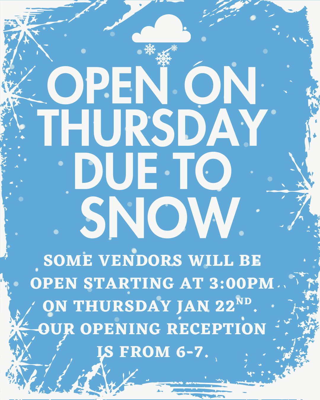 Due to the shortened schedule, many of our vendors will be opening early on Thursday. Pick up something special to work on while the snow pours on Saturday.